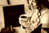 Close-up of woman drinking coffee while take break after work on the laptop. Woman sitting on a couch at home.