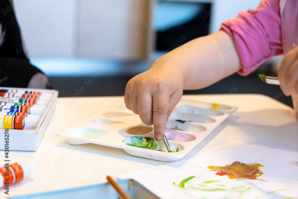 Child playing with watercolor tubes tempera oil paints