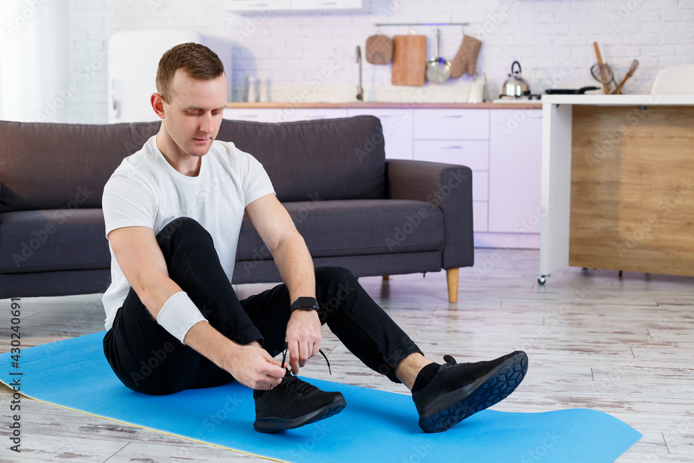 A young man goes in for sports at home, ties the laces on sneakers before training. Healthy lifestyle
