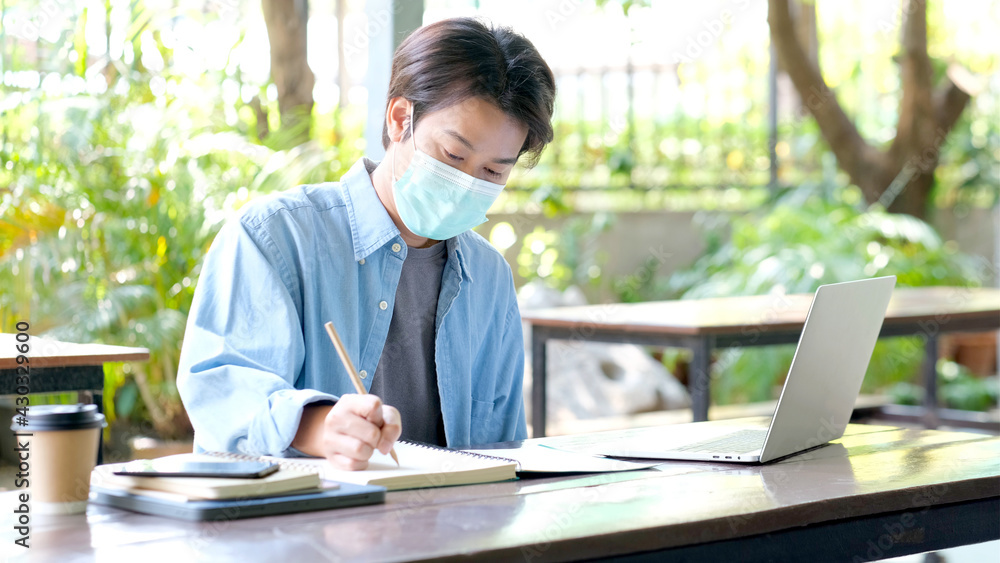 Young asian campus student man wearing protection mask while online study in campus, coronavirus prevention in university, social distancing, online learning