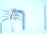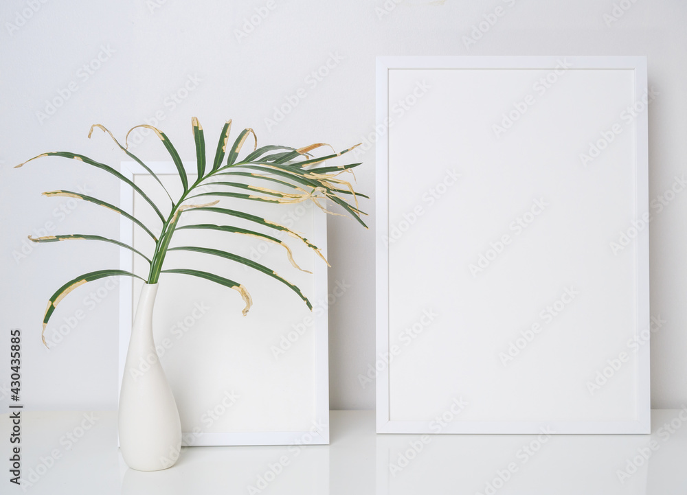 Two mock up white wooden poster frame decor with dried palm leaves in modern white vase on white table and wall background