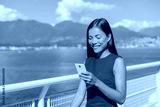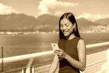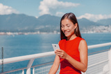 Asian young woman using mobile phone holding it in hand while walking commuting to work. Happy multiracial businesswoman smiling outside in Vancouver, Canada.