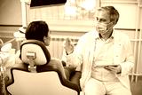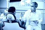 Dentist using touchpad and talking to female patient during appointment at dentist's office.