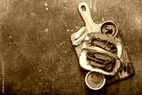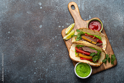 Traditional Mexican dish Beef fajitas tacos served on wooden cutting board with tomato salsa and guacamole on rustic stone background from above with space for text, American Mexican food
