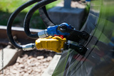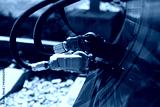 Close up of modern locomotive parts. Pneumatic brake system. Black rubber hoses, blue and yellow connectors. Nur-sultan, Kazakhstan. Locomotive-building plant.