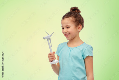 sustainable energy, power and people concept - happy smiling girl with toy wind turbine over green background