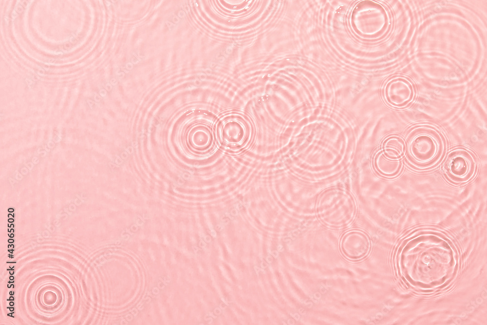 de-focused. Closeup of pink transparent clear calm water surface texture with ripples, splashes and bubbles. Trendy abstract summer nature background. Coral colored waves in sunlight.
