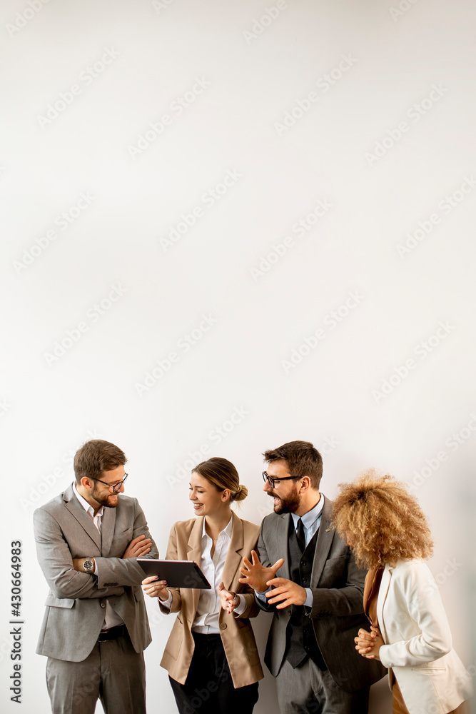 Multiethnic business people using digital tablet while standing by the wall in the office