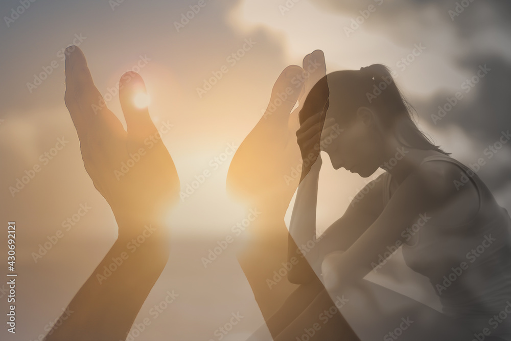 Praying hands in the sky, and sad woman in need of help. Salvation and religious belief concept.
