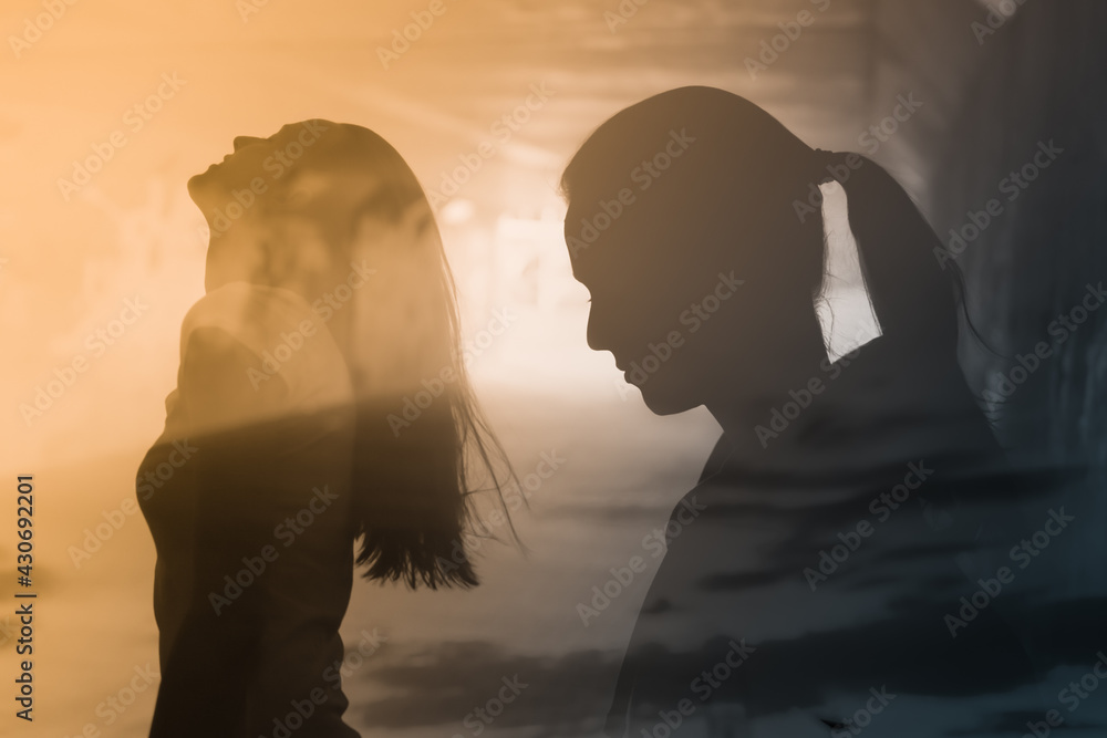 Sad woman becomes happy and free. People letting go of fears, sadness, grief and pain concept. Salvation concept
