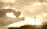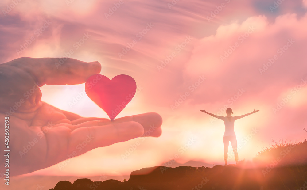Happy woman reaching out to the sky feeling loved. Religious belief, salvation concept.