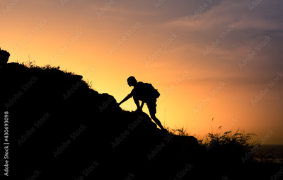 Young man climbing up edge of mountain. Ambition and courage concept.