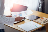 Businesswoman hands holding business documents papers, financial statistics reports graphs and charts at the office