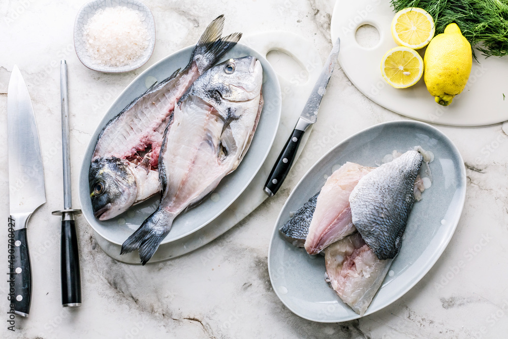 close-up view of fresh raw healthy sea bream fish filet with lemon and herbs