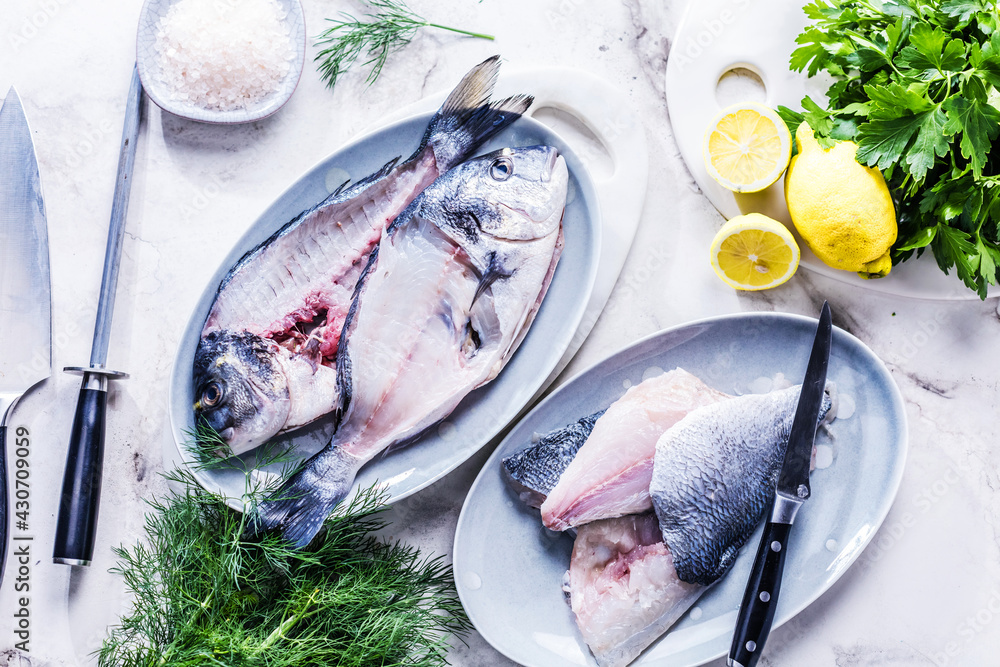 close-up view of fresh raw healthy sea bream fish filet with lemon and herbs