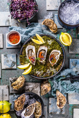 Top view of delicious oysters on ice with lemon and salmon caviar.