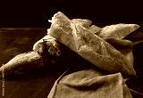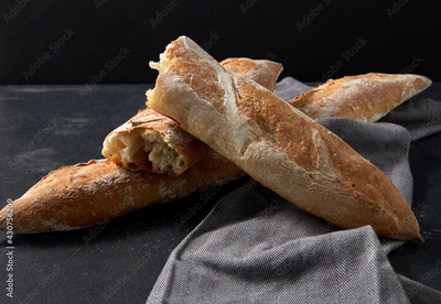 food, baking and cooking concept - close up of baguette bread on kitchen towel