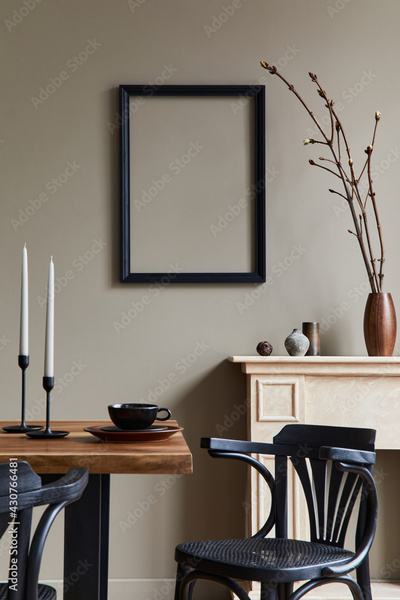 Rustic interior design of dining room with wooden family table, candelstick, retro chair, cup of coffee, decoration, mock up picture frame and elegant personal accessories. Beige wall. Template.