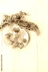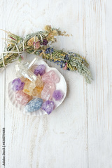 Healing minerals gemstones, floral bundle incense for fumigation, aroma cleaning home. Wiccan Witchcraft. Crystal Ritual, esoteric spiritual practice, filling of good energy. flat lay
