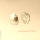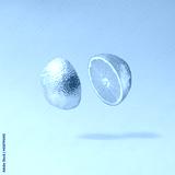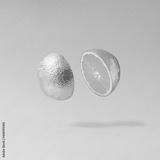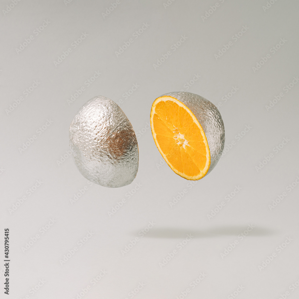 Sliced silver metallic orange fruit against gray background. Minimal cyberpunk or retro futurism fruit composition.