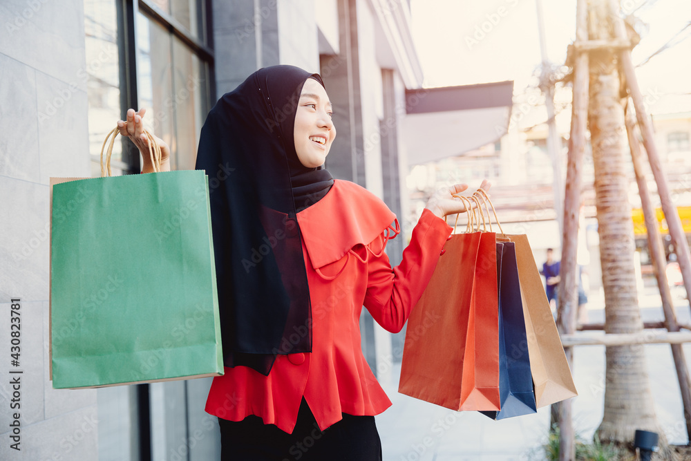 Shopping Arab Muslim adult woman in veil hijab clothes holding bags walk in city street enjoy happy smile.
