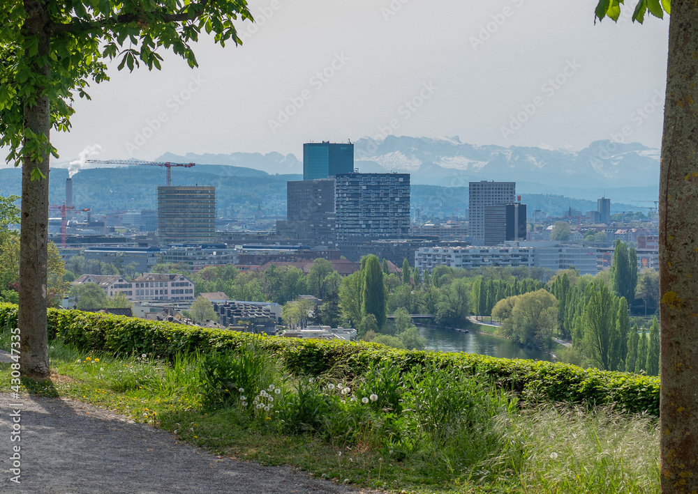 View over the skyscrapers of Zurich West, Switzerland, to the Alps