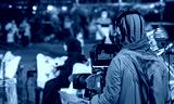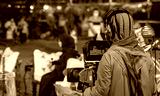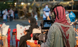 An Arab man recording a live interview video at an outdoor event in Qatar. Selective focus