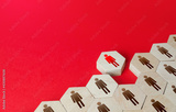 A man leaves a formation of people figurines hexagons. Violation of the integrity of the system, non-conformist. Integration of a person into society. Staff recruitment, recruiting. Exception from