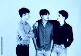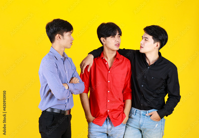 3 adults asian handsome men are friends and 1 of them feeling sad but his 2 friends standing to encouragement. Shooting in studio with isolated yellow background. In concept Friendships