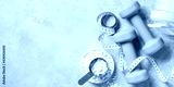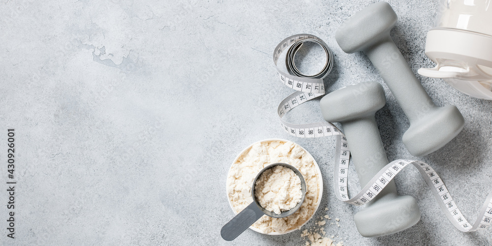 Whey protein powder, shaker with protein cocktail and dumbbells