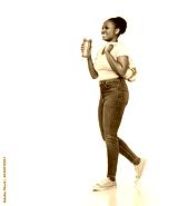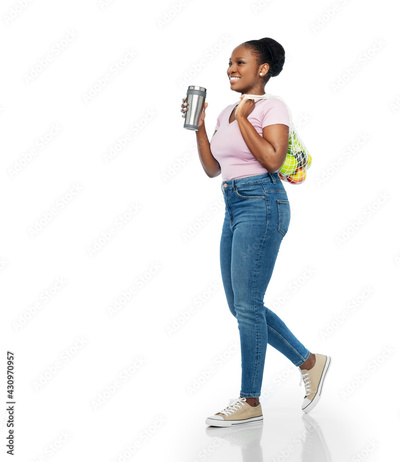 sustainability and people concept - smiling young african american woman with thermo cup for hot drinks and food in string bag walking over white background