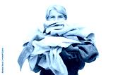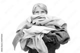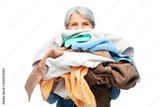 cleaning, laundry and old people concept - senior woman in denim shirt with heap of bath towels over white background