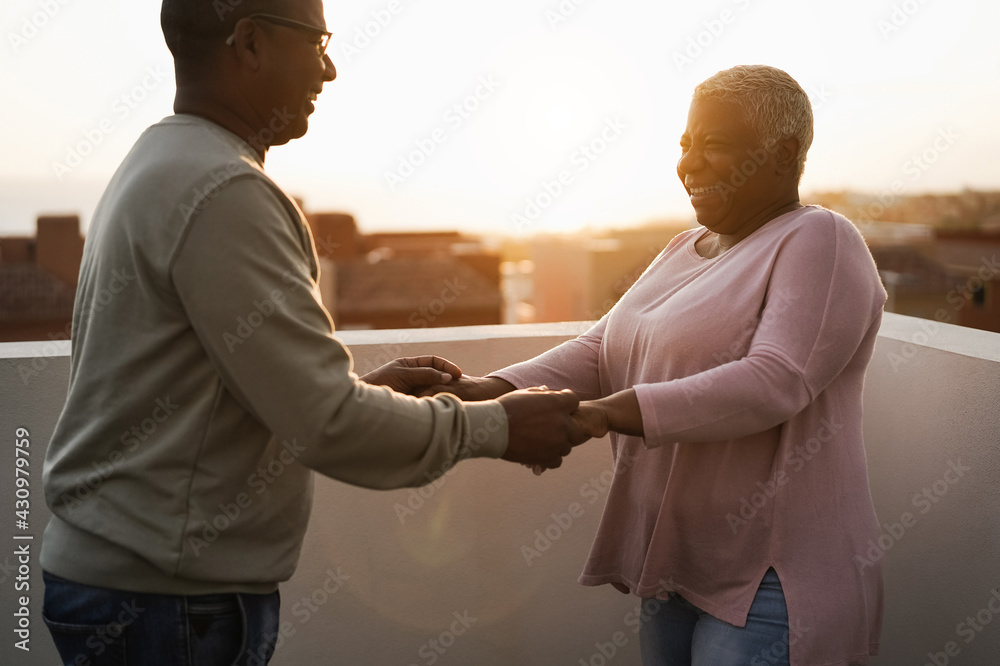 Happy black couple dancing outdoors at summer sunset - Focus on woman face