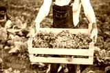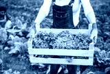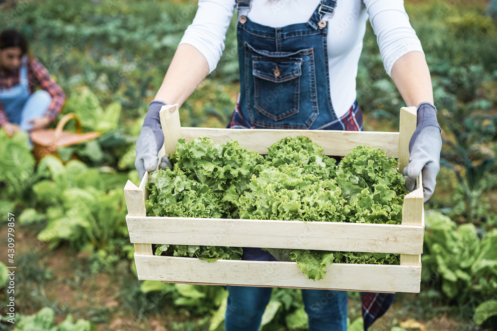 Farmer woman holding wood box with fresh organic lettuce - Main focus on right hand