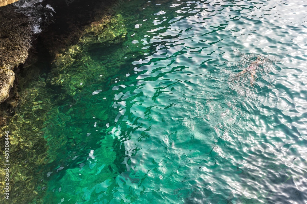 Malta, Marsaxlokk, August 2019. Silhouette of a man swimming under water.