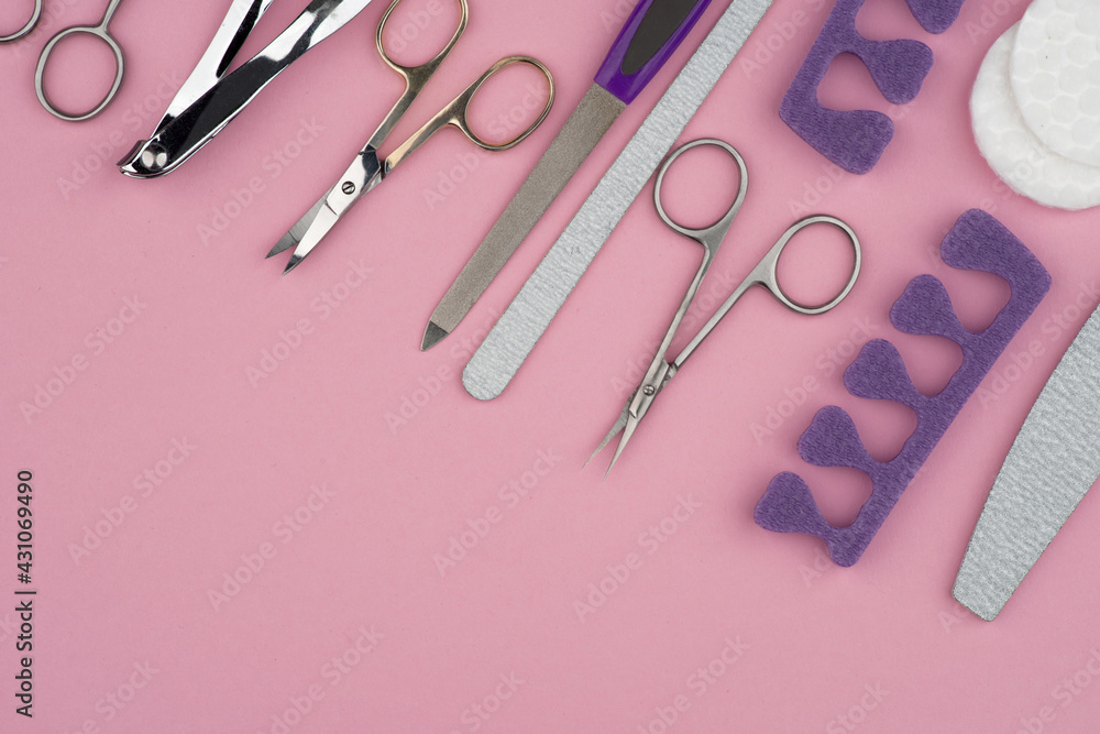 Manicure and pedicure flatlay concept, cosmetic accessories