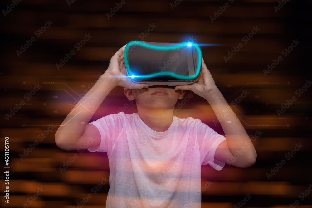 Little Asian nice girl wearing virtual reality, amazing futuristic space virtual imaging with black background