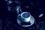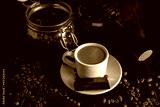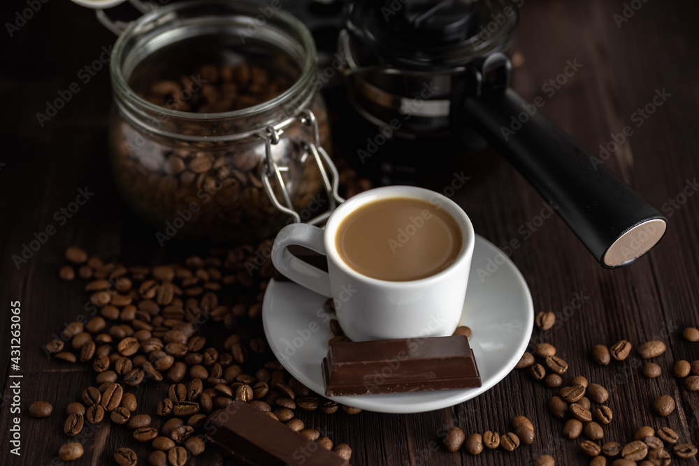 A cup of coffee with chocolates and coffee beans on a wooden table.