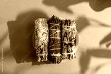 White sage, cedar, yerba santa tied in a bunch on a concrete plate. Set of incense for fumigation, beautifully lit by sunlight. Top view. Close-up color photo. Background with shadow.