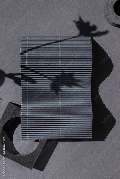 Black abstract geometric shapes with sun harsh shadows frame. Dark modern concept background. Copy space