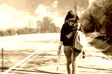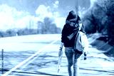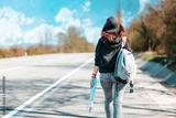 The concept of hitchhiking trips and local travel. Hipster woman in a cap, with backpack walking down the road holding a paper map in her hand. Blurred road on the background. Rear view