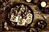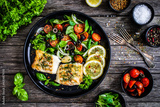 Fish dish - fried cod fillet with fresh vegetable salad on wooden table