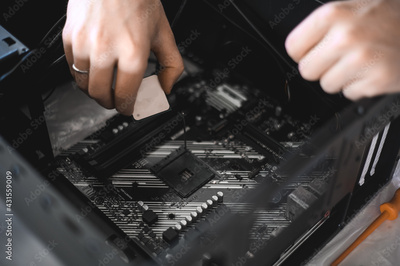 portrait of a handsome nerd man is servicing Computer motherboard and cooler.
