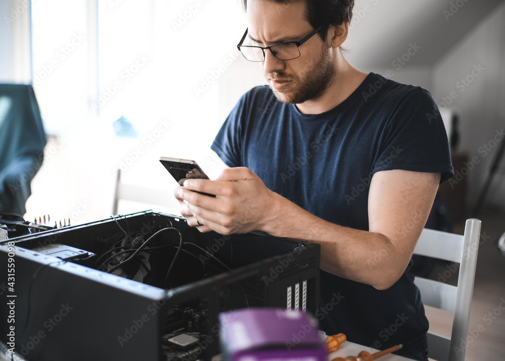 portrait of a handsome nerd man is servicing Computer motherboard and cooler.