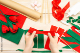 How to make a tulip flower out of paper and marshmallows at home. Marshmallow inside a red tulip bud. Hands make a red tulip. Step-by-step instruction. DIY children's art project