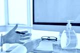 The doctor is in his office on the premises of the clinic. Disinfects hands with a dispenser