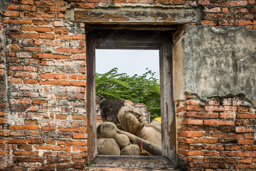 A sleeping Buddha statue at Wat Phutthaisawan in Ayutthaya, Thailand.