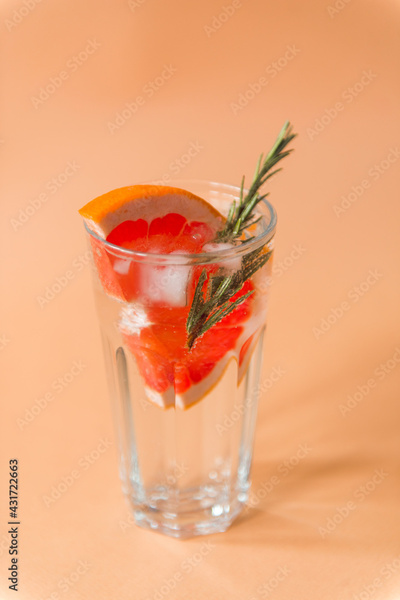 mineral water in a glass with grapefruit and rosemary on beige background