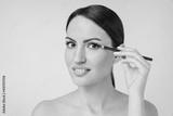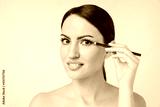 Pretty young caucasian woman with bare shoulders naked applying makeup with eye pencil isolated over beige background. Cosmetics, clean skin, body care, beautician concept