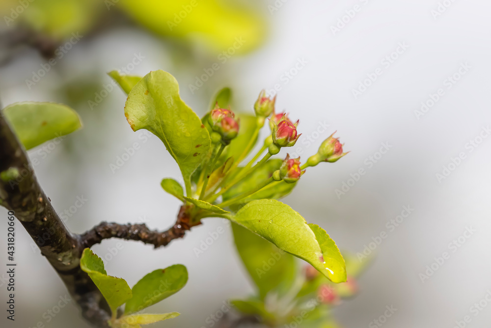 Young leaves and spring bloom on a tree branch